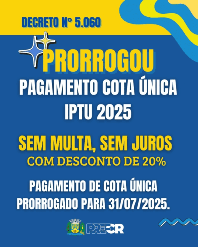 Para pagamento à vista em Cota Única, com um desconto especial de 20%, o prazo de vencimento foi prorrogado para o dia 31 de julho de 2025, conforme o Decreto nº 5.060, de 7 de julho.