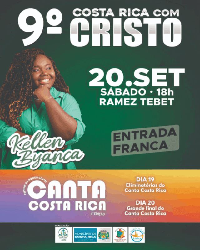 Nesta sexta-feira e sábado, dias 19 e 20 de setembro de 2025, Costa Rica/MS realiza o 9º Costa Rica com Cristo, um dos eventos gospel mais esperados da região, organizado pelo COMPLECOR – Conselho de Pastores e Líderes Evangélicos e Associação Viva Melhor, com o apoio da Prefeitura Municipal, através da Secretaria de Esporte e Cultura. O evento acontecerá no Centro de Eventos Ramez Tebet, a partir das 18h.