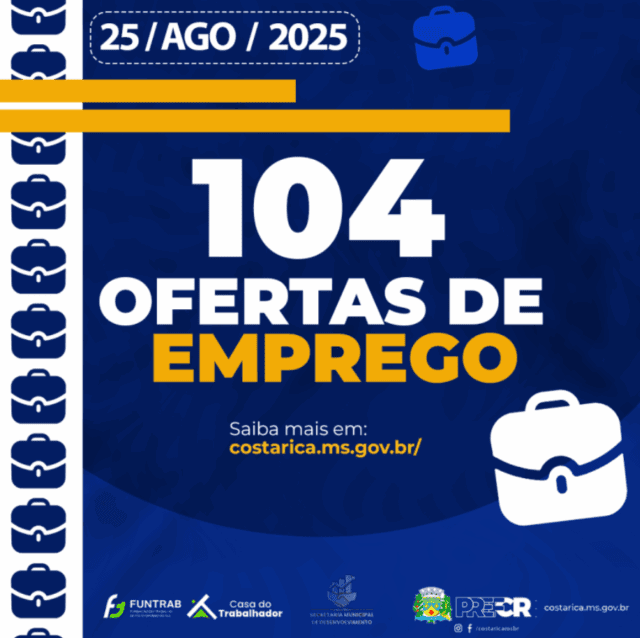 A Casa do Trabalhador de Costa Rica disponibiliza 104 vagas de emprego na cidade de Costa Rica em diferentes setores nesta segunda-feira, 25 de agosto de 2025. As vagas atendem comércio, serviços, agropecuária, indústria, construção civil e diversas outras áreas. Cabe ressaltar que as oportunidades disponíveis exigem, na maioria dos casos, Ensino Médio completo.