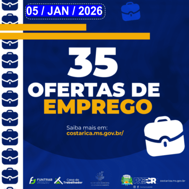 A Casa do Trabalhador de Costa Rica disponibiliza 35 vagas de Emprego na cidade de Costa Rica em diferentes setores nesta segunda-feira, 5 de janeiro de 2026. As vagas atendem comércio, serviços, agropecuária, indústria, construção civil e diversas outras áreas. Cabe ressaltar que as oportunidades disponíveis exigem, na maioria dos casos, Ensino Fundamental completo.