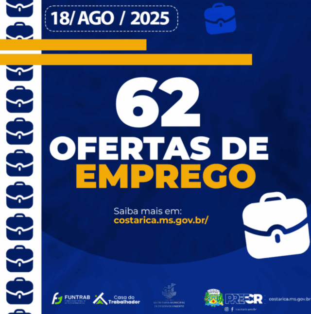 A Casa do Trabalhador de Costa Rica disponibiliza 62 vagas de emprego na cidade de Costa Rica em diferentes setores nesta segunda-feira, 18 de agosto de 2025. As vagas atendem comércio, serviços, agropecuária, indústria, construção civil e diversas outras áreas. Cabe ressaltar que as oportunidades disponíveis exigem, na maioria dos casos, Ensino Médio completo.