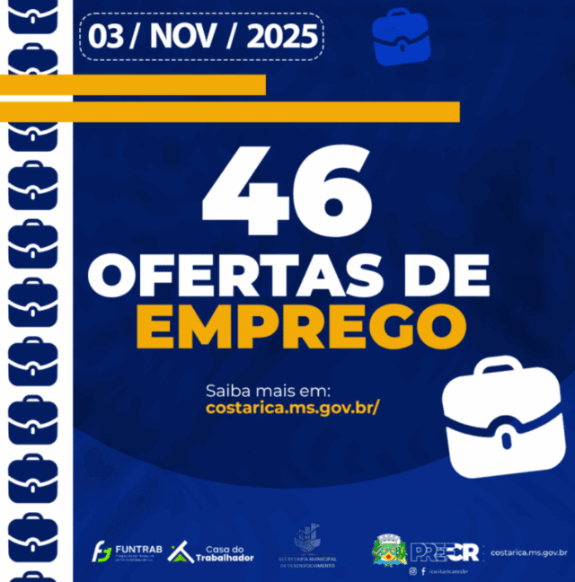 A Casa do Trabalhador de Costa Rica disponibiliza 46 vagas de Emprego na cidade de Costa Rica em diferentes setores nesta segunda-feira, 3 de novembro de 2025. As vagas atendem comércio, serviços, agropecuária, indústria, construção civil e diversas outras áreas. Cabe ressaltar que as oportunidades disponíveis exigem, na maioria dos casos, Ensino Fundamental completo.