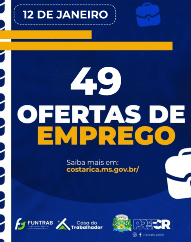 A Casa do Trabalhador de Costa Rica disponibiliza 49 vagas de Emprego na cidade de Costa Rica em diferentes setores nesta segunda-feira, 12 de janeiro de 2026. As vagas atendem comércio, serviços, agropecuária, indústria, construção civil e diversas outras áreas. Cabe ressaltar que as oportunidades disponíveis exigem, na maioria dos casos, Ensino Fundamental completo.