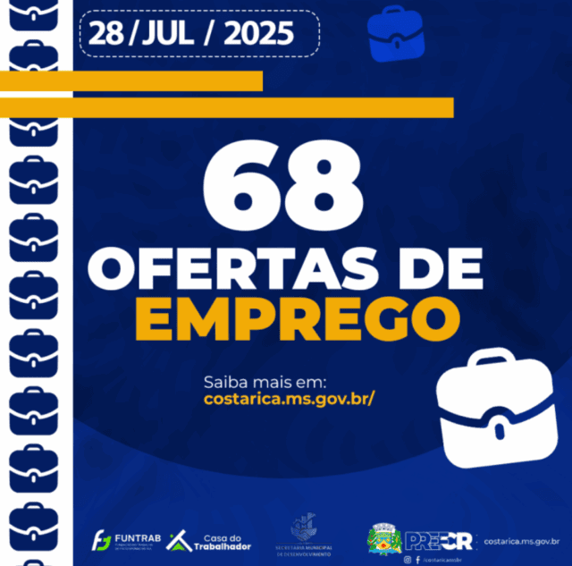 A Casa do Trabalhador de Costa Rica disponibiliza 68 vagas de emprego na cidade de Costa Rica em diferentes setores nesta segunda-feira, 28 de julho de 2025. As vagas atendem comércio, serviços, agropecuária, indústria, construção civil e diversas outras áreas. Cabe ressaltar que as oportunidades disponíveis exigem, na maioria dos casos, Ensino Médio completo.