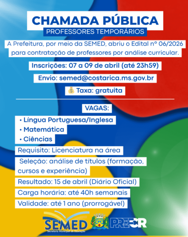 A Prefeitura de Costa Rica, por meio da Secretaria Municipal de Educação (SEMED), publicou o Edital nº 06/2026 que abre chamada pública para contratação temporária de professores para atuação na Rede Municipal de Ensino (REME). A medida visa suprir a falta de profissionais, diante da inexistência de candidatos aptos no banco de reserva de processos seletivos anteriores.