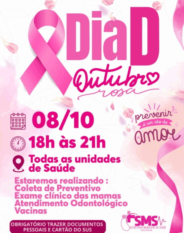 Nesta quarta-feira, 8 de outubro de 2025, a Prefeitura de Costa Rica, por meio da Secretaria Municipal de Saúde (SMS), promove o Dia D do Outubro Rosa. O evento ocorrerá em todas as Estratégias de Saúde da Família da cidade, das 18h às 21h, com o objetivo de reforçar a importância da prevenção do câncer de mama.