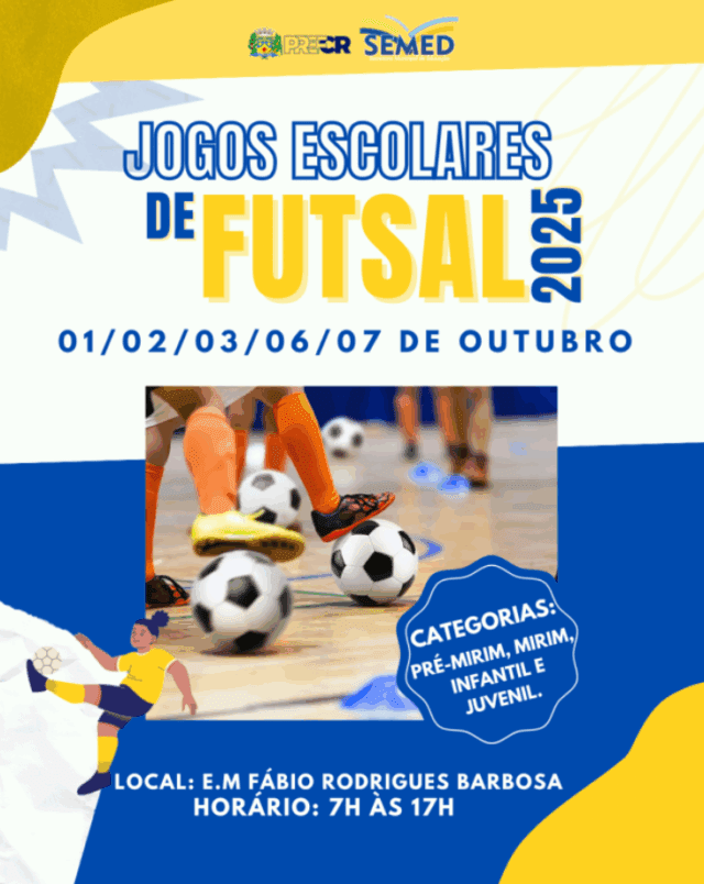 A cidade de Costa Rica/MS se prepara para receber os Jogos Escolares de Futsal nos dias 1, 2, 3, 6 e 7 de outubro de 2025. O evento, que ocorrerá na Escola Fábio Rodrigues Barbosa, é uma iniciativa da Prefeitura, através da Secretaria Municipal de Educação (SEMED), com o apoio das secretarias de Esporte e Cultura, e de Saúde. A entrada será gratuita, permitindo que a comunidade prestigie as competições.
