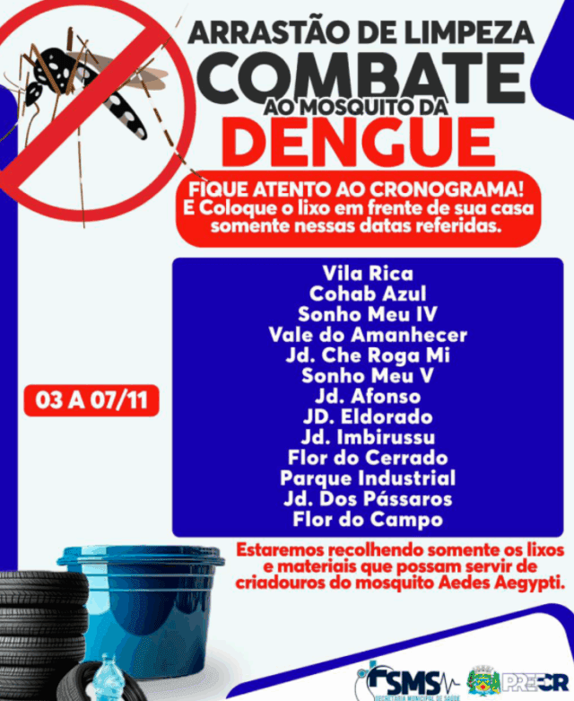 A Prefeitura de Costa Rica, por meio da Secretaria Municipal de Saúde (SMS) e do Departamento de Controle de Vetores, dá sequência, entre os dias 3 e 7 de novembro de 2025, a mais uma etapa do mutirão de limpeza para combater o mosquito Aedes aegypti, transmissor de doenças como dengue, chikungunya, zika e febre amarela urbana.