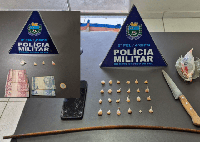 Durante varredura nas proximidades, foi constatado que o invólucro dispensado continha 24 porções de crack, totalizando aproximadamente 12 gramas, já fracionadas e prontas para comercialização.