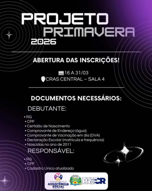 A Prefeitura de Costa Rica, por meio da Secretaria de Assistência Social, abriu na segunda-feira, 16 de março de 2026, as inscrições para o Projeto Primavera 2026. A iniciativa é voltada para adolescentes do município nascidas no ano de 2011 e segue com inscrições abertas até o dia 31 de março.