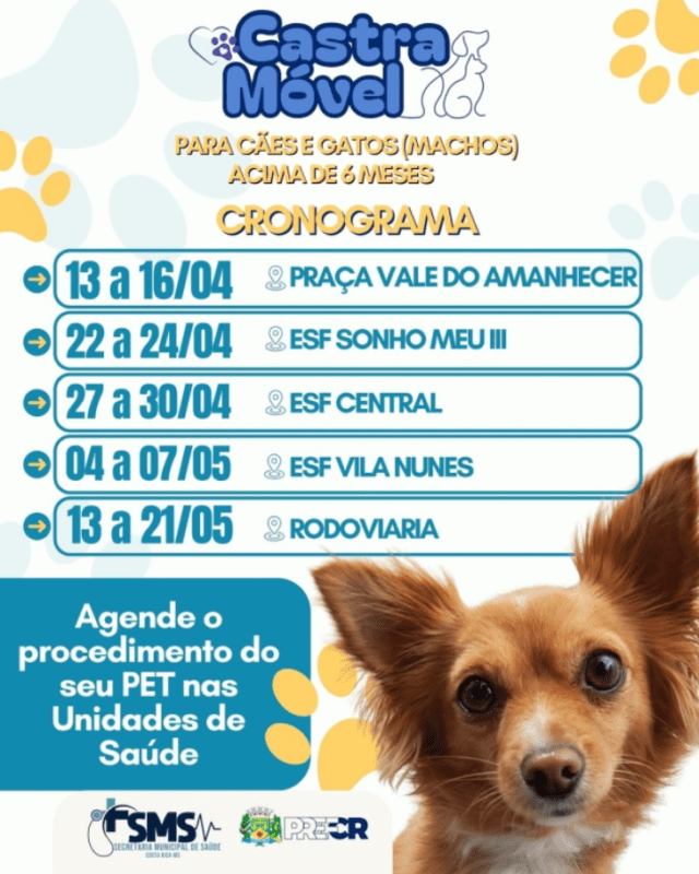 A Prefeitura de Costa Rica, por meio da Vigilância em Saúde, anunciou o cronograma do Castramóvel para o final de abril e parte do mês de maio de 2026. A unidade estará disponível para atender cães e gatos machos com mais de seis meses, oferecendo serviços em diversos locais da cidade. As datas de atendimento são: de 13 a 16 de abril na Praça Vale do Amanhecer (ao lado do Demutran), de 22 a 24 de abril na ESF Sonho Meu III, de 27 a 30 de abril na ESF Central, de 4 a 7 de maio na ESF Vila Nunes e de 13 a 21 de maio na Estação Rodoviária.